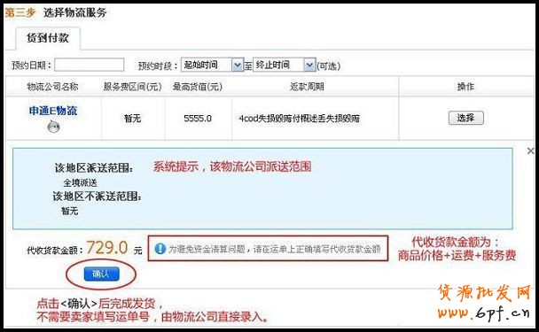 3、系統會提示您,該物流公司的派送范圍,并計算代收貨款的總額,計算方式為:商品價格+運費+服務費。請您在運單上正確填寫,物流公司將按此金額收款。