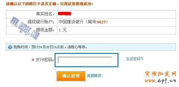 確認銀行卡、姓名和提現(xiàn)金額,輸入支付密碼即可。