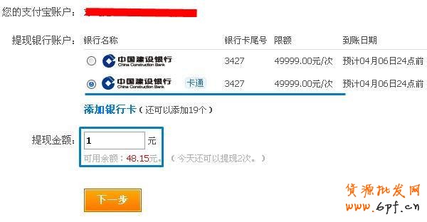 選擇銀行卡,如果你添加了其他的銀行卡注意選擇,我們這里選擇支付寶卡通(本文以建設銀行支付寶卡通為例)。選擇好支付寶卡通后輸入提現(xiàn)金額。然后點擊下一步。
