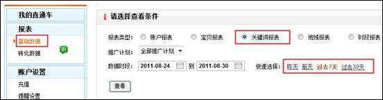 查看直通車首頁“基礎數據”中“關鍵詞報表”,根據您的時間,確定時間段,選擇“點擊量不為0的關鍵詞”進行下載,得到賬戶所有有點擊的關鍵詞。