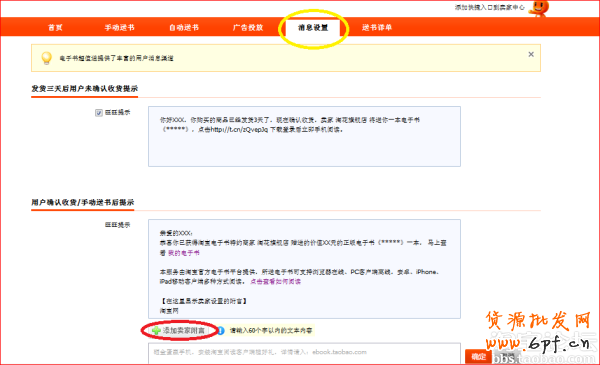 請在手動送書/活動送書之前,先進入超值送后臺“消息設置”中選擇“添加賣家附言”,這樣送書成功后,買家收到的旺旺消息內會顯示出你添加的這段文字,買家看到的展現請看下面旺旺消息內容截圖