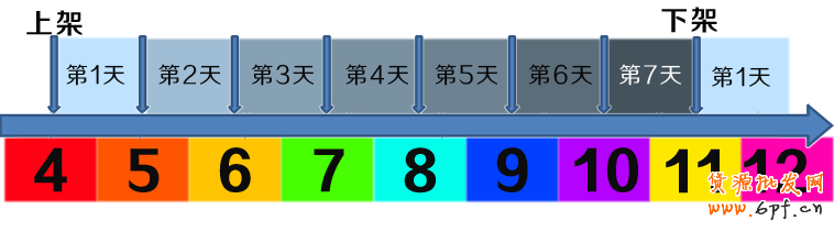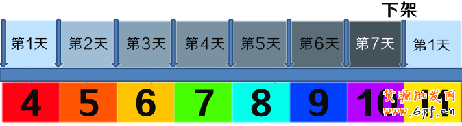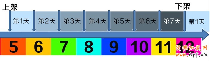 上圖中,天數里填充的顏色越深說明權重越高,排名越靠前。如果我們10號晚上24點下架的話,寶貝最高權重點在10號白天,這段時間我們如果能搶到好的排名,是可以讓那些有欲望購物、正在提前搜索、想確定購物清單的顧客看到我們。這樣我們可以搶奪先機,提前占據顧客的大腦。