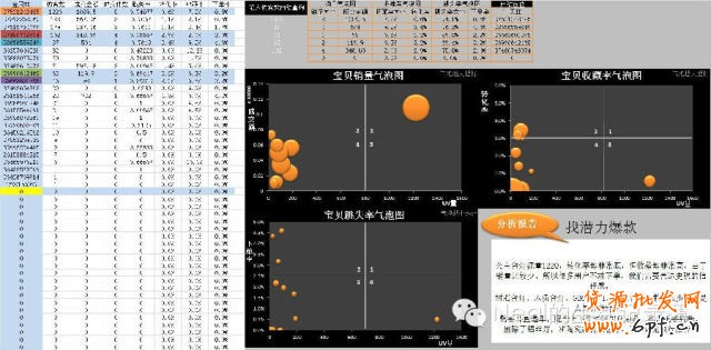 這個(gè)是朋友的店鋪,調(diào)用了30天的數(shù)據(jù),包括訪客數(shù)、成交金額、成交件數(shù)、跳失率、轉(zhuǎn)化率、收藏率、下單率等7項(xiàng)數(shù)據(jù),然后生成氣泡圖,并根據(jù)這些數(shù)據(jù)分析,得出在您的店鋪當(dāng)中除了已成型的爆款,還有哪些商品值得您重視,哪些商品是被自己忽視過的,并給出改進(jìn)意見,比如頁面優(yōu)化、運(yùn)營手法、促銷手段,商品本身在營銷方面存在的短板等,擁有這樣的一個(gè)全店寶貝數(shù)據(jù),我們不僅可以對店鋪每一款寶貝的情況了如指掌,還可以通過人為干預(yù)快速提升寶貝爆發(fā)的過程。
