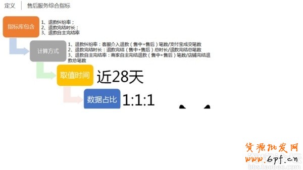 售后服務綜合指標包括:退款糾紛率、退款完結時長、退款自主完結率。具體定義見上圖的計算方式,取值時間是近28天,計算時數據占比1:1:1。