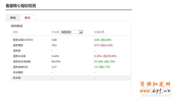 我們可以看到,對比同層商家,這家店鋪的DSR稍微低一點,退款糾紛率也低。注意,雖然店鋪跟同層商家比退款糾紛率低,但是考核是跟同行所有商家PK,所以這個數據的參考意義不大。