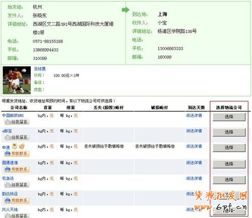 頁面的下半部分是三種選擇方式:推薦物流、自己聯系物流和不需要物流。首先以推薦物流為例,看看它的發貨過程。當你的鼠標移動到推薦物流區域,此區域變成亮黃色,點擊這個區域中的“選擇該方式”按鈕(如下圖)