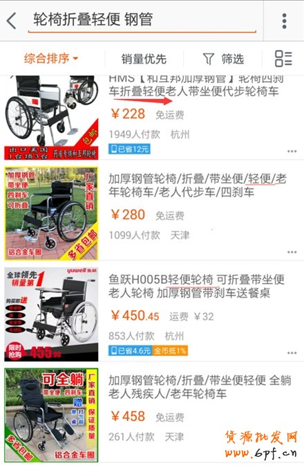 我們可以看到,搜索出來的產(chǎn)品標(biāo)題都是帶有鋼管這個詞的,那么同樣搜索輪椅,點(diǎn)擊:輪椅折疊 輕便