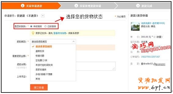 第一步:選擇您實際貨物狀態和退款原因,填寫退款金額和退款說明之后就可以提交退款申請了。