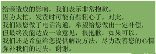 如果您是顧客,看到這里,不用多說,肯定是后面的解釋更讓人可以接受一些。而且,大多數人都明白,物流的問題大家也難以控制,偶爾慢一點也是很正常的。想清楚了,有些人還是會把評價改回來的。