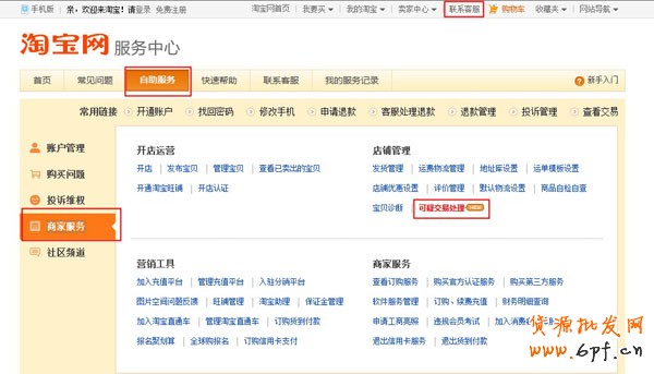 6、如果您認為您遇到了惡拍,可以在登錄狀態下點擊淘寶網頁右上角聯系客服——自助服務——商家服務——可疑交易處理。我們設置了專屬投訴通道: