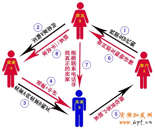 邏輯關系:賣家A為飾品類賣家,但是真正身份為中介商家(皮包公司,無產品);賣家B也為飾品類賣家,真正的有貨商家;客戶A為朋友B的朋友。