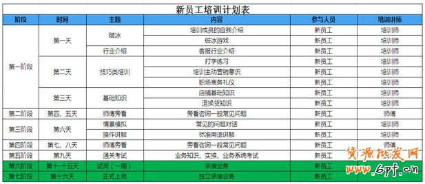 其次就是業(yè)務(wù)知識(shí)的梳理,針對(duì)電商客服主要所應(yīng)對(duì)的產(chǎn)品咨詢問題是最常見的培訓(xùn)內(nèi)容以及客服工作流程等。在新員工培訓(xùn)中,店鋪產(chǎn)品體系培訓(xùn)是重點(diǎn),主要針對(duì)產(chǎn)品品牌介紹、尺寸、搭配、材質(zhì)等待一切顧客常見問題進(jìn)行培訓(xùn)。對(duì)于新員工培訓(xùn),有個(gè)計(jì)劃表可供大家參考: