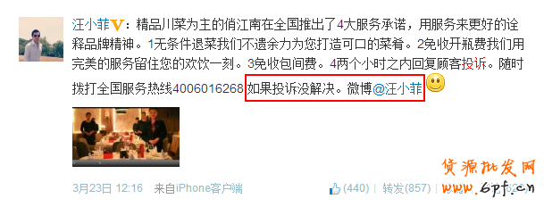 俏江南集團總裁汪小菲重視客服,在微博上請顧客“如果投訴沒解決。微博@汪小菲”