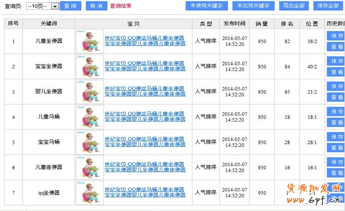 然后,我們查詢這些關鍵詞下,對自己有威脅的寶貝的上下架情況。比如“寶寶坐便器”這個關鍵詞,人氣排名在第2頁第40名,那么我們就把人氣下前兩頁的所有寶貝的上下架都通過軟件查詢出來形成下圖: