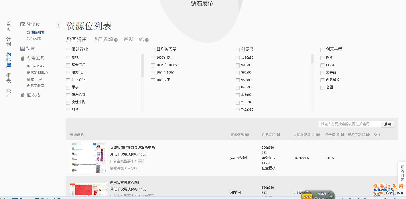 進入鉆石展位的新平臺,我們能夠看見資源位列表中清晰地羅列出電子商務、視頻、網址、小說等熱門行業網站,商家可以根據自己的類目屬性選擇合適的資源,清楚地知道自己的品牌展示在哪里。