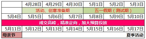 所以做好節前的預熱和投放至關重要!今年重點投放時間應該在5月4日-5月11日。