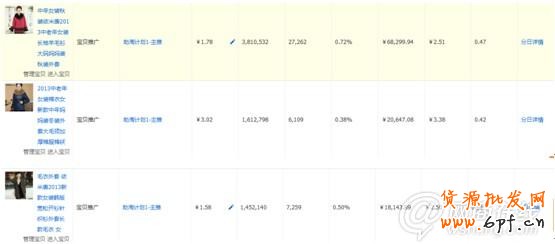 3)我們抓取花費前三的寶貝,整體分析,第一和第三款寶貝在當前的季節來說,不是很應季,花費也比較多,那么我們果斷的暫停掉這兩款寶貝。對于棉衣來說,雖然當時的一個投入產出比不是很高,但是比較應季,點擊率有進一步提升的一個空間。