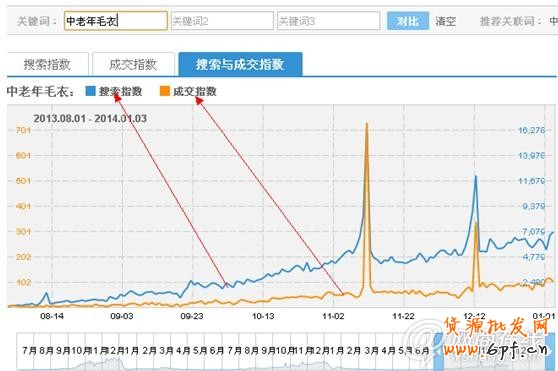 下面我們就針對中老年大類目、中老年棉衣和中老年毛衣進行具體的一個分析,店鋪主營類目就是中老年毛衣。但是目前這個階段,毛衣整體的搜索量相對是呈現下降的趨勢的,那么我們需要改變一下我們產品結構。經過與掌柜的溝通,我們跟著市場大盤來進行相應的調整。