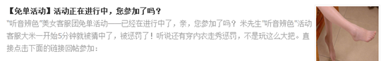 活動當天,我們形式更多樣化,不僅有猜音頻,還有猜美女圖!我們在帖子中上傳了音頻鏈接,并同步直播了美女內衣秀的圖片。
