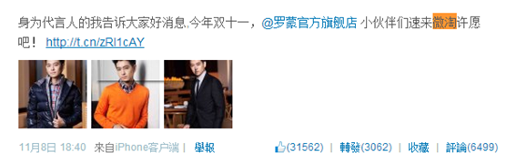 令商家可喜的是,雙11大促當天,林志穎發了一條微博,為微淘許愿街做宣傳,并提供羅蒙官方旗艦店微淘的鏈接,直接將林志穎的粉絲引入羅蒙官方旗艦店的微淘,為店鋪吸引了大量粉絲,把消費者對林志穎的吸引力轉化為對林志穎定制款寶貝的消費引導上,從而加大寶貝的曝光率以及轉化率。
