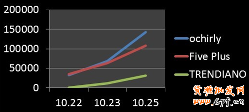 從上圖中可以看出,歐時力的三個賬號粉絲在活動后,都得到了較快的增長,三個品牌中以TRENDIANO的粉絲數增長最快,Ochirly 憑借單獨的品牌宣傳活動,反超之前領先的Five Plus粉絲數。也為品牌雙11當天的活動成交打下了基礎。