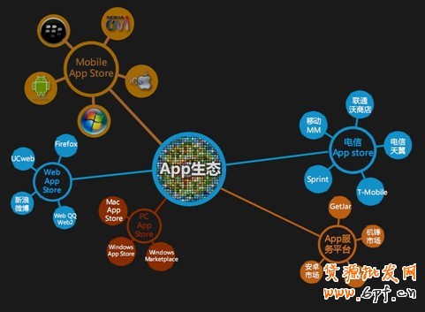 主要是通過開發者平臺上傳應用,然而平臺主要包含有硬件開發商(APPStore,Ovi),軟件開發商(Android Market,Windows Mobile Marketplace),網絡運營商(移動 MM,天翼空間,沃商店),獨立商店(安卓市場,OpenFeint),以及一些 B2C 應用平臺(Amazon AndroidAPP Store)等等,在國內市場中,主要由硬件開發商商店、網絡運營商、獨立商店等支撐著,其中,硬件開發商商店:聯想應用商店、智匯于(華為);網絡運營 商:移動 MM、電信天翼空間、聯通沃商店;獨立商店:安卓市場、安智市場、機鋒市場、愛米軟件商店、優億市場、掌上應用匯、安卓市場、安智市場、開齊商店、N 多市場、安卓星空、安豐下載、力趣安卓市場等。