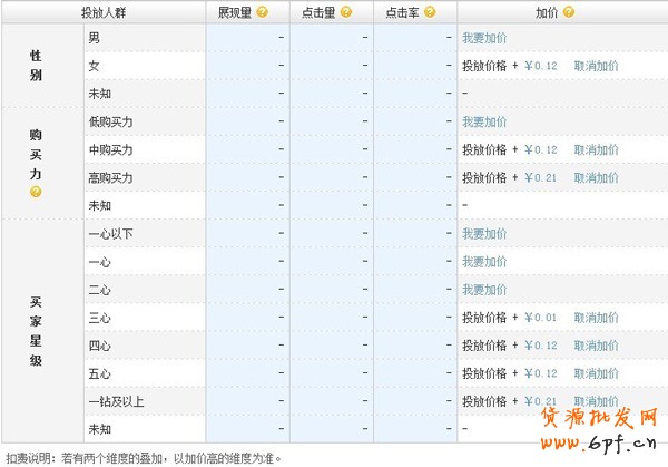 您可通過分析對不同性別、購買力和買家星級所代表人群投放的效果數據,設置你要加價的人群及加價幅度,設置投放人群只針對定向使用。