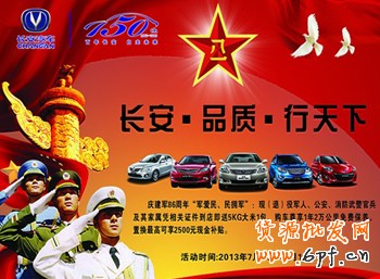 “獻禮建軍節——為了抒發我們對人民子弟兵的無比愛戴之情,百年傳承軍工企-長安汽車珠海眾大利4S店把最優惠的價格獻給我們最可愛的人,屆時更有4臺特價車車型抄底促銷。我們沒有華麗的詞語來形容軍人,沒有動聽的歌來贊美軍人,也沒有珍貴的禮物來送給軍人,我們有的,只是一種樸實的橄欖情懷,一個普通人對軍人的真誠尊敬。”