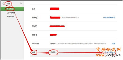 2、然后在“賬號信息”的內容頁面找到“類型”,點擊“升級為服務號”進入下一個頁面。具體如下圖: