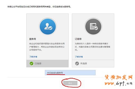 3、進入升級服務號的頁面后,只要選擇“服務號”,并點擊確認就可以成功升級了。但是必須要注意,這兩種號只能選擇一次,確定選擇之后就不能再做修改了,所以一定要謹慎考慮,哪一種最適合自己。