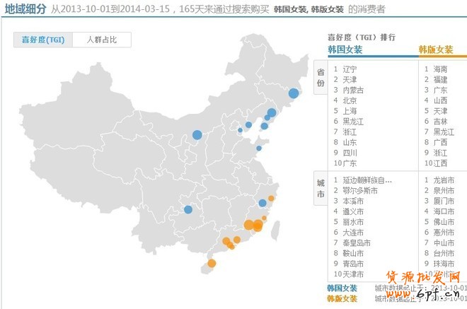 從地域上來看,韓版女裝主要集中是南方,而韓國女裝卻是集中在東北的地方。所以這個時候問題就來了。你的產(chǎn)品主要人群到底是南方還是北方呢?如果你的是北方的話你覺得用上韓版女裝能好嗎?他符合個性搜索嗎?還有在直通車的計劃的地域設(shè)置這個時候就發(fā)揮大作用了 。