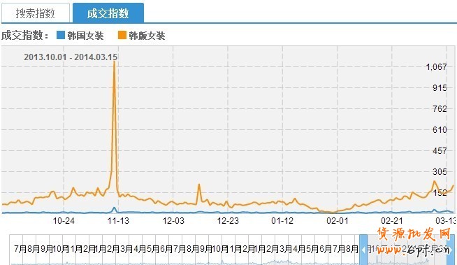 從搜索指數(shù)和成交指數(shù)來說,韓版女裝的人要比韓國女裝高。在這方面韓版女裝看起來要比韓國女裝好。