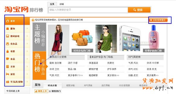 首頁,打開淘寶排行榜,右邊的榜單模塊是跟淘寶客相連的 ,淘寶客們可以進(jìn)去仔細(xì)研究下,里面有很全面的排名。為了更生動明了地向大家展示淘寶指數(shù)查詢找出優(yōu)勢詞的作用,借“精品女裝”作為例子展示: