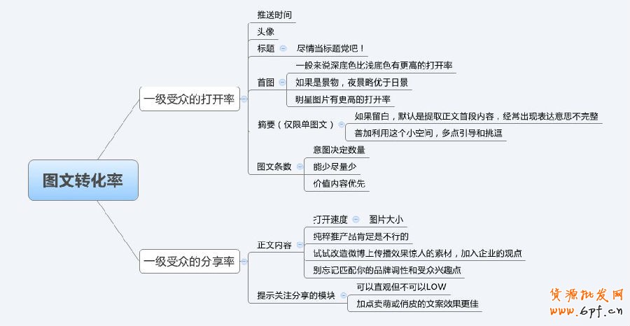 寫到這里,已經破拆完了影響一級打開率和一級分享率的主要因素。作為運營者,能做的就是讓一級受眾盡可能地打開、分享。至于,這條微信能不能走得更遠,完全取決于你的內容了。筆者做了一張簡易的思維導圖供大家更直觀明了地了解這些細節(jié):