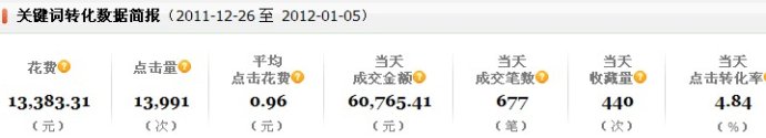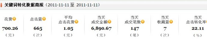 從2011年雙11那天,利用了雙11的巨大流量,給我的店鋪帶來了將近1:10的ROI準(zhǔn)化率!可惜的是,當(dāng)天沒有大力推廣,只花費(fèi)了665元推廣費(fèi)。所以一直很遺憾!個(gè)人認(rèn)為,雙11那天,顧客擁有強(qiáng)勁的購(gòu)買力和購(gòu)買意向,如果我大力推廣的話,當(dāng)天通過直通車成交的金額估計(jì)會(huì)在3-5萬(wàn)的樣子。現(xiàn)在也只能遺憾了,等待下一次機(jī)會(huì),隨時(shí)準(zhǔn)備著!