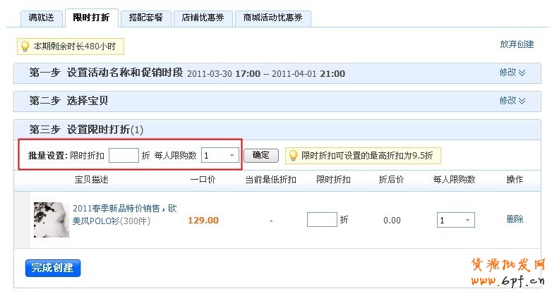 4.1每期限時折扣共480小時,限50次,30天為一期。每次活動時間不能少于1個小時。每個活動最多包含20個商品。
