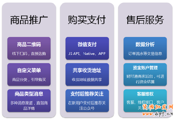 另外據微信官方介紹,除了微信支付接口外,微信還為商家服務號提供了一套完整的移動購物解決方案。以微信支付為核心功能,微信官方提供了用戶身份識別、微信地址共享、支付結算、客戶關系維護、售后維權、交易統計的整套移動購物解決方案。