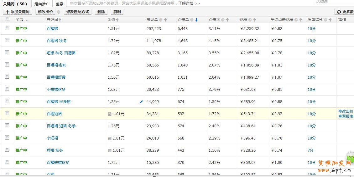 下圖是今年秋冬實操的一款百褶裙數據,剛剛改版的新版直通車頁面,數據保證新鮮出爐真實可靠,大家可以看到高點擊率下的實際PPC基本是和出價打了五折的,即便是質量得分只有7分“短裙 秋冬”這樣的熱詞,甚至“百褶裙”這樣的行業熱門詞??梢婞c擊率之重要,至于如何提高轉化率這個就不多說了,煉內功的事情網上已經說得夠清楚了。