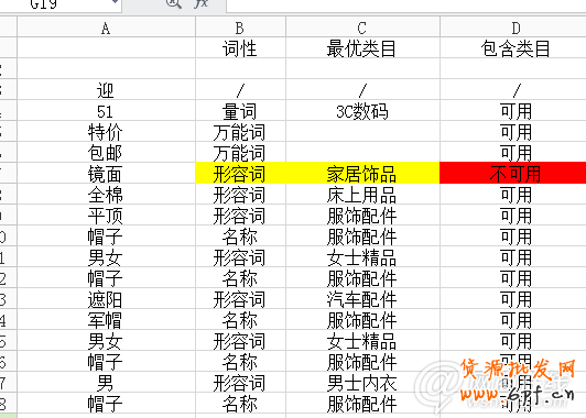 我們看A類:是標題拆分后的一個結果,B類是詞性,C類是最優類目,D類是該寶貝的最優類目的包含情況,以上數據采集來自數據魔方。