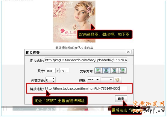 第五步,回到模板的裝修頁面,同樣點擊“編輯”在要更改圖片的地方,雙擊那張圖片,就會彈出一個圖片設置的框框,第一個鏈接就是放圖片的地址的,就是剛剛在圖片屬性復制的那個鏈接。第二個就是放寶貝出售頁面的鏈接地址的。都填寫好后,就可以點擊確定。