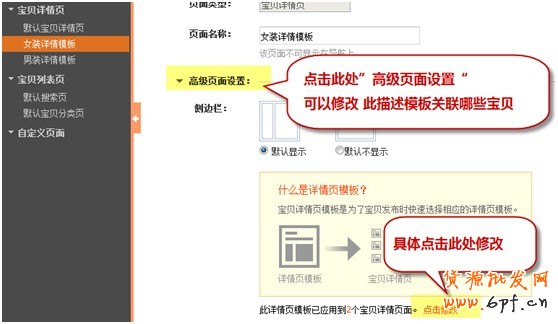第六,修改模板。如果想更改“女裝詳情頁模板”中關(guān)聯(lián)的寶貝,可以點(diǎn)擊選中此模板,然后點(diǎn)擊高級頁面設(shè)置,里面就可以點(diǎn)擊修改了。