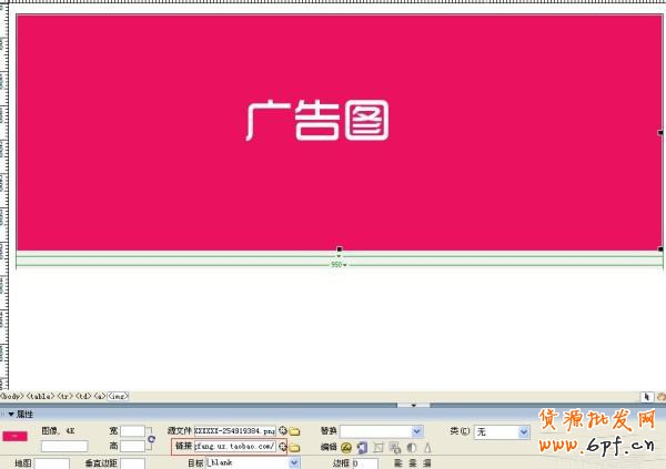 7、當你設置好圖片后,可以給圖片設置相對應的鏈接,切換回“設計”界面,選中圖片后,在頁面下方的屬性框“鏈接”處填寫圖片點擊后要展現的頁面,然后將“目標”設置為“_blank”,意為點擊圖片后鏈接的頁面在新窗口打開(可自己決定設置或者不設置哈),如下:
