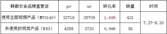 韓都衣舍品牌直營(yíng)店最先參與了主圖視頻的內(nèi)測(cè),從數(shù)據(jù)反饋結(jié)構(gòu)來(lái)看,PV、UV變化與主圖視頻關(guān)系不大,但使用該功能的單件商品轉(zhuǎn)化率及銷量的提升,主圖視頻功不可沒(méi)。