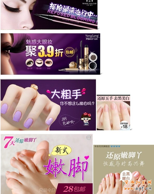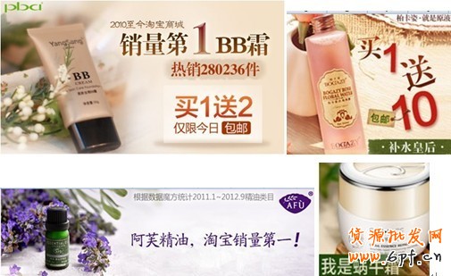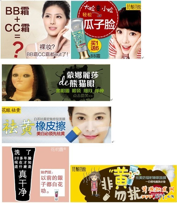 做鉆展的人分析每月的優秀鉆展素材已經是門必修課了,有研究的人肯定能發現活動類型的鉆展素材會常常出現在優秀素材里,可是一直全場X折、9.9元起,品牌還要不要做了?常規銷售要怎么辦?所以我把2012年1月到2013年1月,一整年的常規素材做了整理,發現有以下幾個類型的廣告點擊率都比較高,因為我是做美妝,所以就做了美妝素材,其實方法論是和其他類目素材是共通的:找出優秀素材之間的共性。