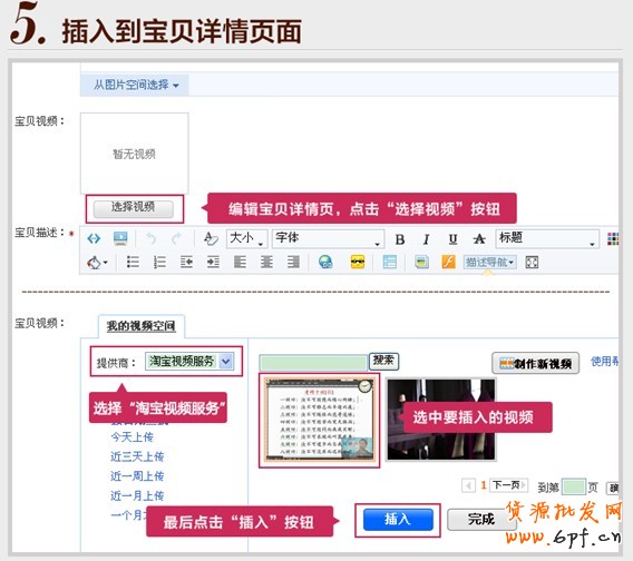 (4)上傳成功后,在1個工作日轉碼、審核后,您的視頻就可以插入寶貝頁面使用了。