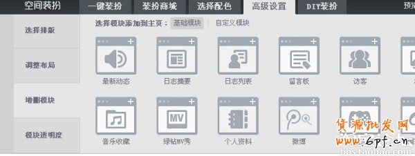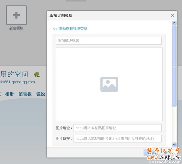 再次進入QQ空間點擊:裝扮---高級設置---增刪模塊---自定義模塊---新建模塊---添加大圖模塊。