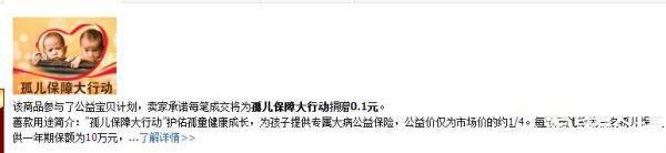 加入公益寶貝后,在寶貝詳情頁就會出現這樣的模塊。這是否會增加寶貝權重,進而影響排名和流量,結論尚待證實。但我只想說,做公益最終要的是心誠,哪怕無所得,也要相信終會有福報吧。或許有些愛心人士看到,會因為這個