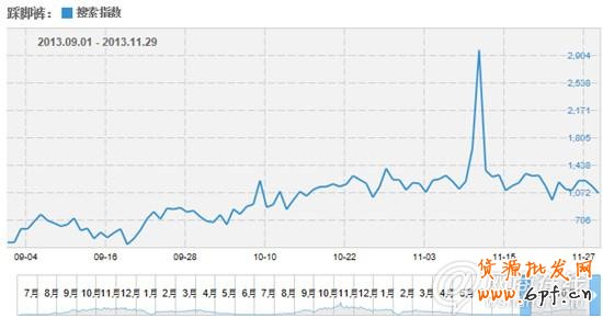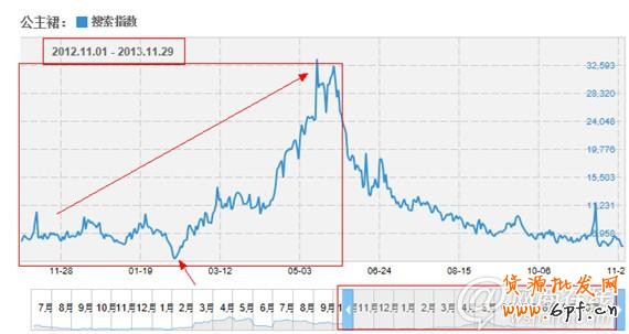 我們把下面的小三角拖到去年的11月份,就會出現從去年11月份到今年11月份的一個整體的發展趨勢。大家看下我用大紅框起來的那個區域,它是一個什么趨勢呢?我們可以看到,從雙11的井噴,到2013年的2月份,整體上一直都是呈現下降的趨勢,然后一直到2月上旬的時候,也就是從去年的2月10號開始,才開始有走高的趨勢。