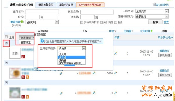 第二步,選擇您想報名參加1212的寶貝,點擊“櫥窗推薦——櫥窗設置”,選擇合適的寶貝設置為櫥窗推薦做好報名前的準備工作