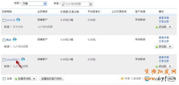 第二步,打標簽。通過客服旺旺,將指定的老客戶打上“老帶新3位以上”的標簽。此外針對老客戶,還可以在會員列表中選擇該標簽。